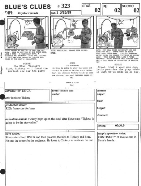 The things we would draw were new characters or objects that we might not have on hand. Then we would scan those in and create the scene in Photoshop. Once we had the scene set up, we imported the script, inserted images, and wrote stage direction in Quark. It was a consistent format that the rest of the team could easily follow. Here’s an example from the first episode that I ever worked on, Blue’s Play: